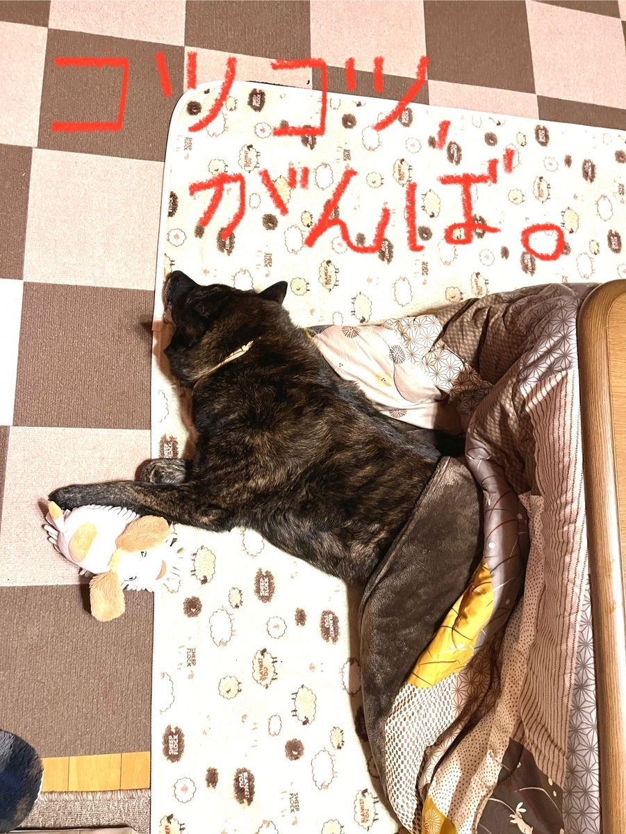 写メはコタツから半身を出しているサン。手元にはオモチャが。コタツは基本寝て使い、手の届く範囲に必要なモノを置いておく、コレ基本なり。